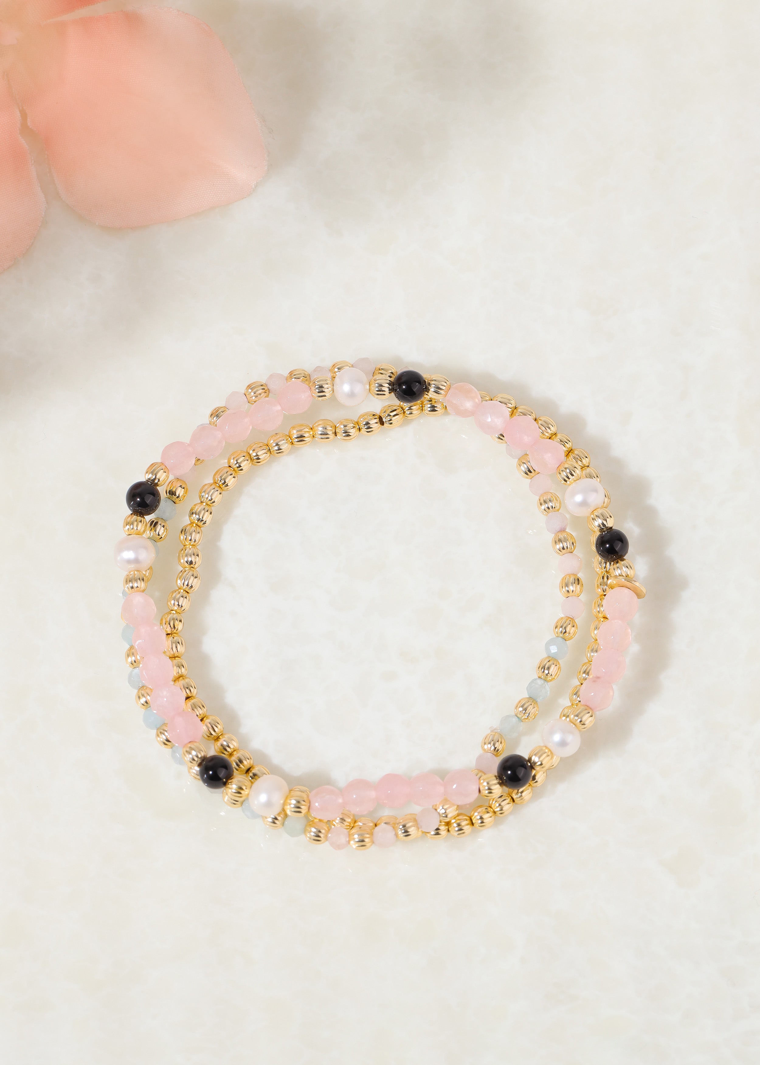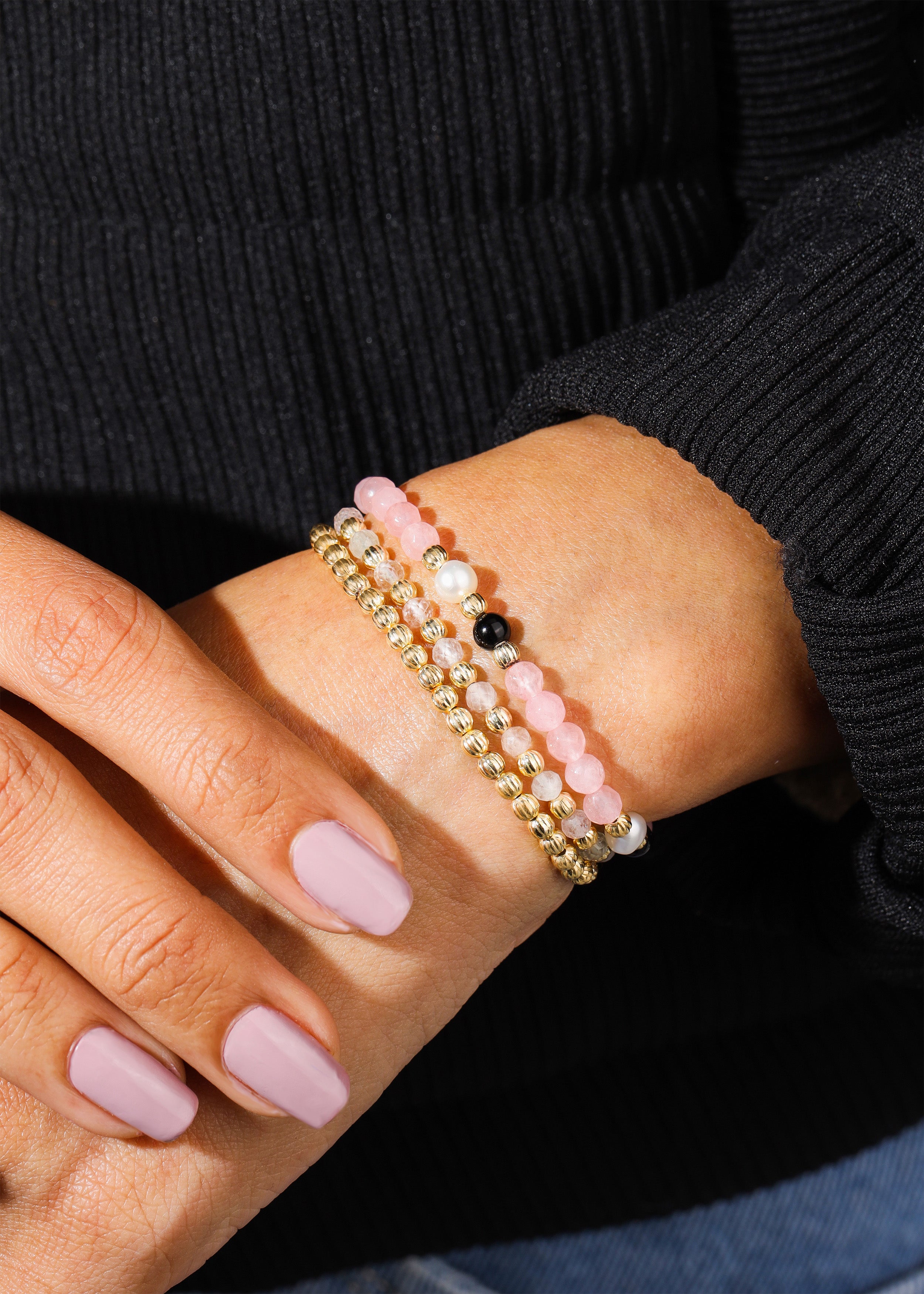 Design Detail: This bracelet stack features a delicate blend of soft pink rose quartz, classic pearls, black onyx, and textured golden brass beads. The mix of smooth and faceted stones creates a playful yet elegant look, perfect for layering. Strung on stretchable elastic, these bracelets offer a comfortable fit and effortless everyday charm.
